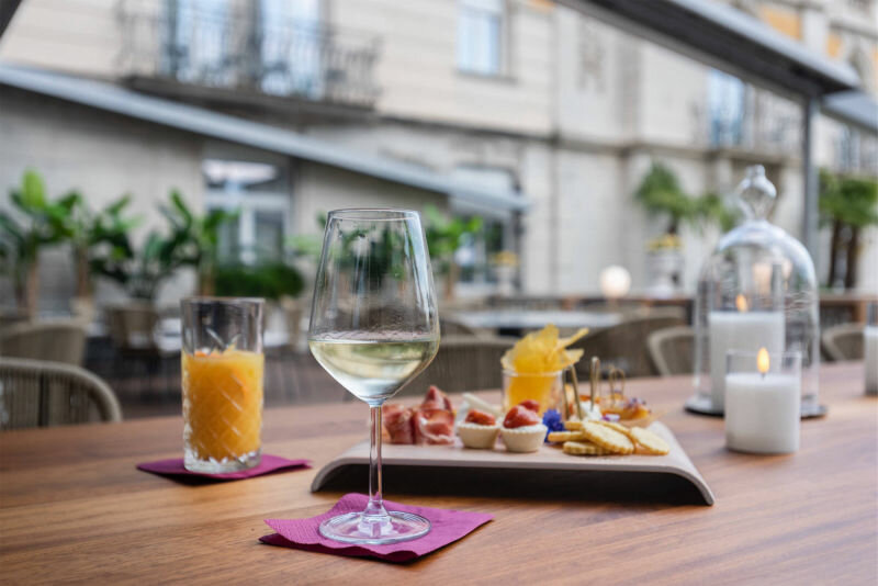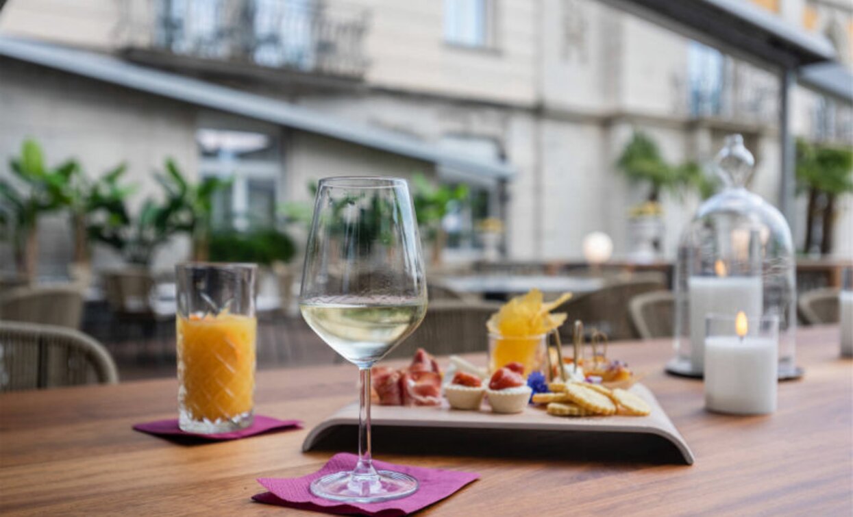 Una spaziosa e moderna terrazza che guarda verso il giardino interno è il luogo ideale per un aperitivo in compagnia, un pranzo di lavoro o un’intima cena per due in un’atmosfera rilassata.